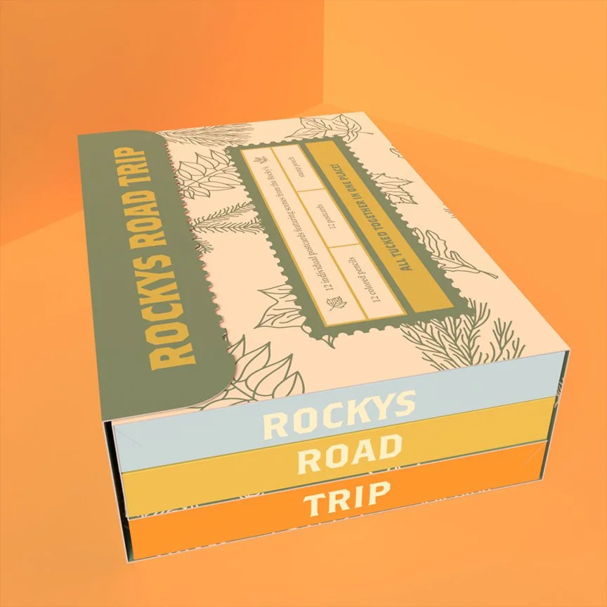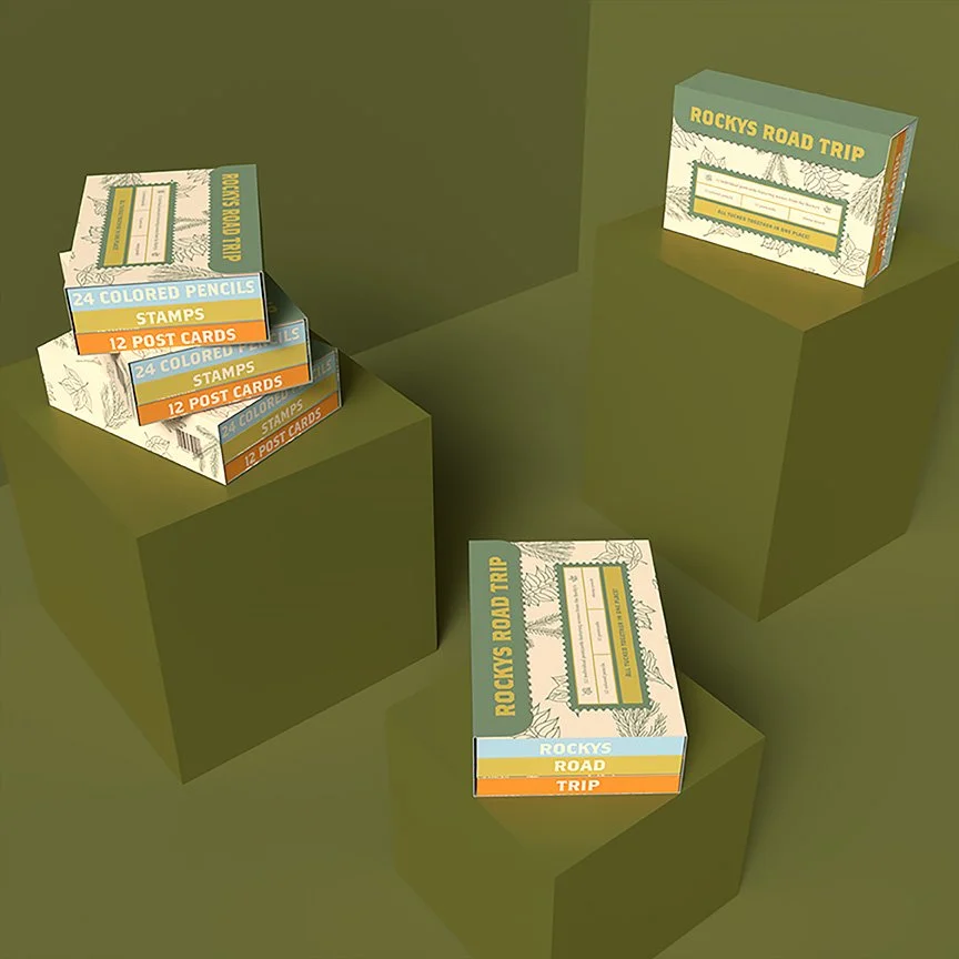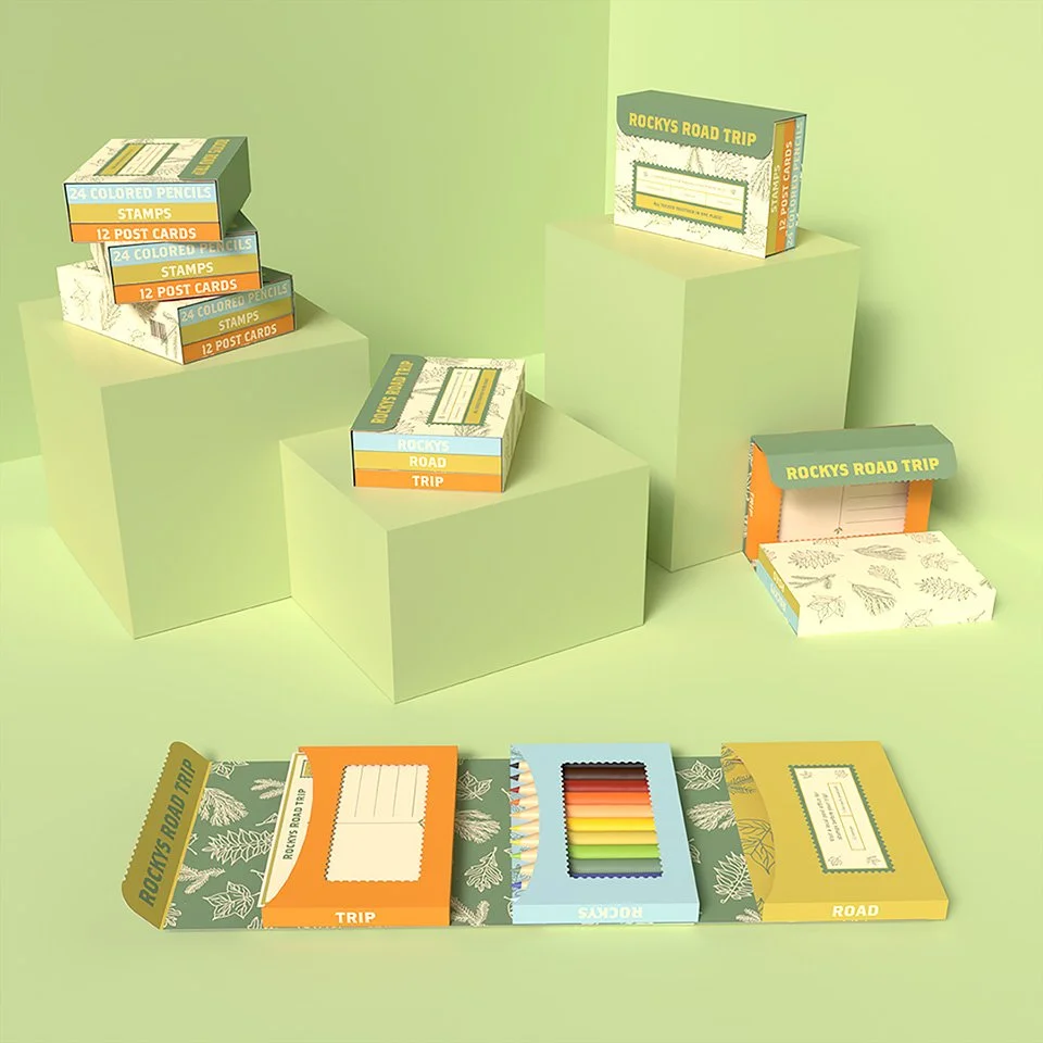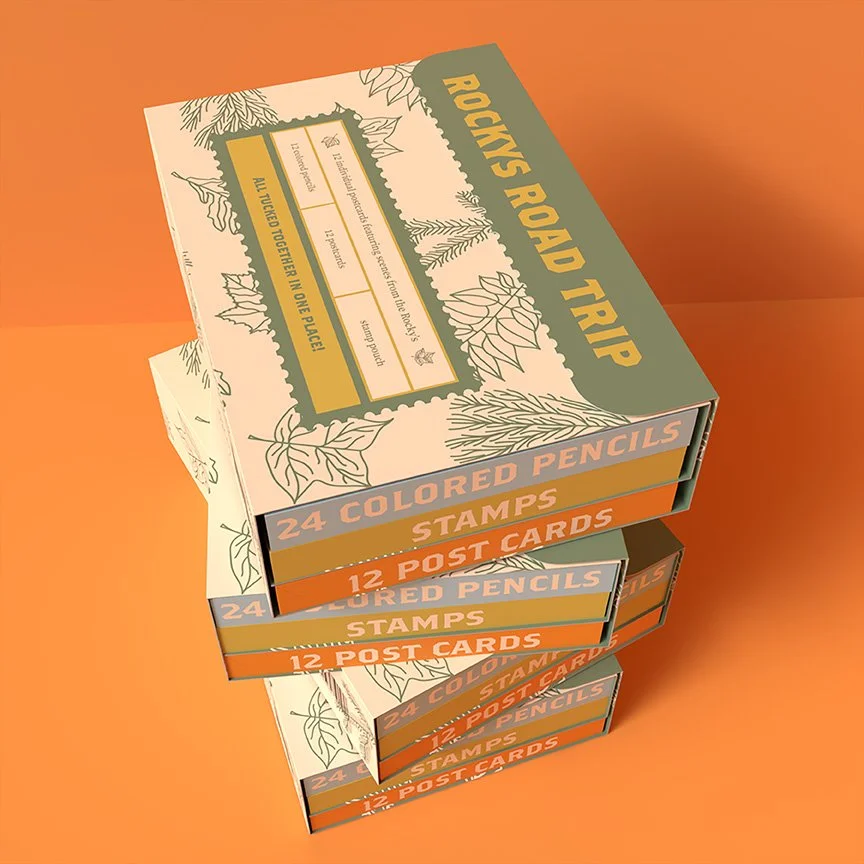 Each box was measured and artwork was given to overlay the outlines, including the three colored boxes inside. Each outline was exported and brought into Fantastic Fold. Here, each box was folded and given its artwork overlay.