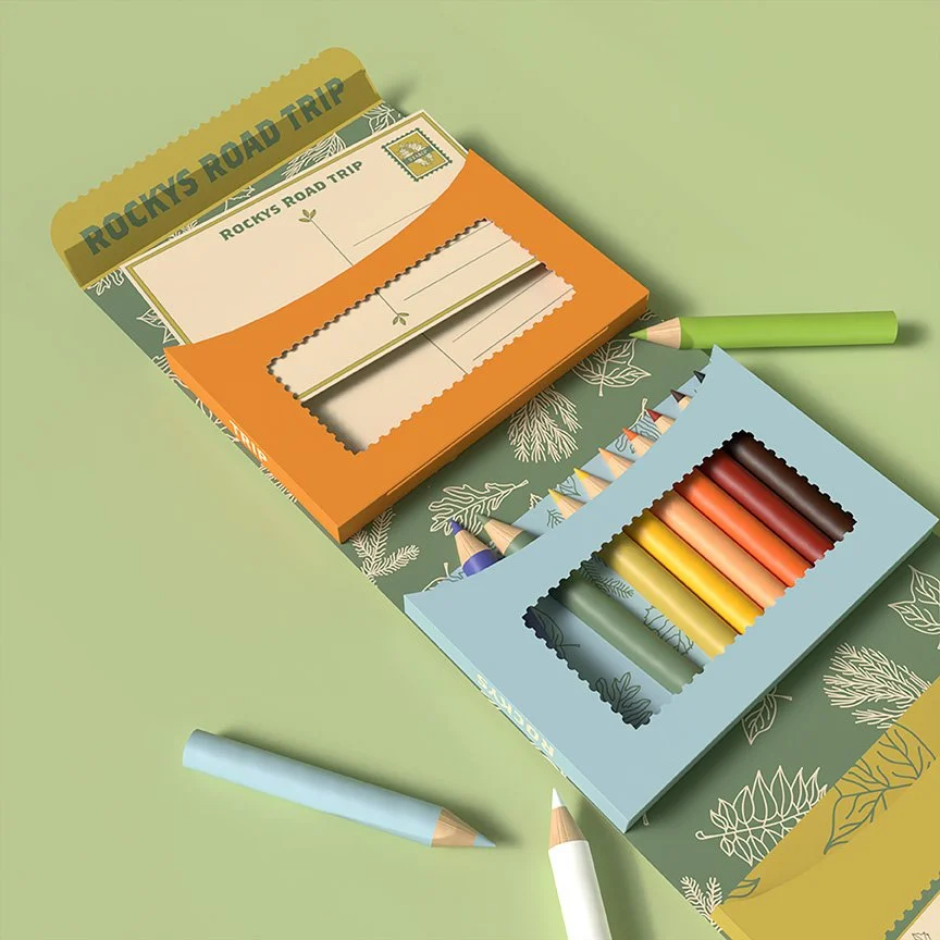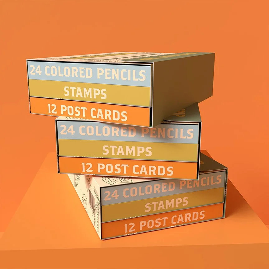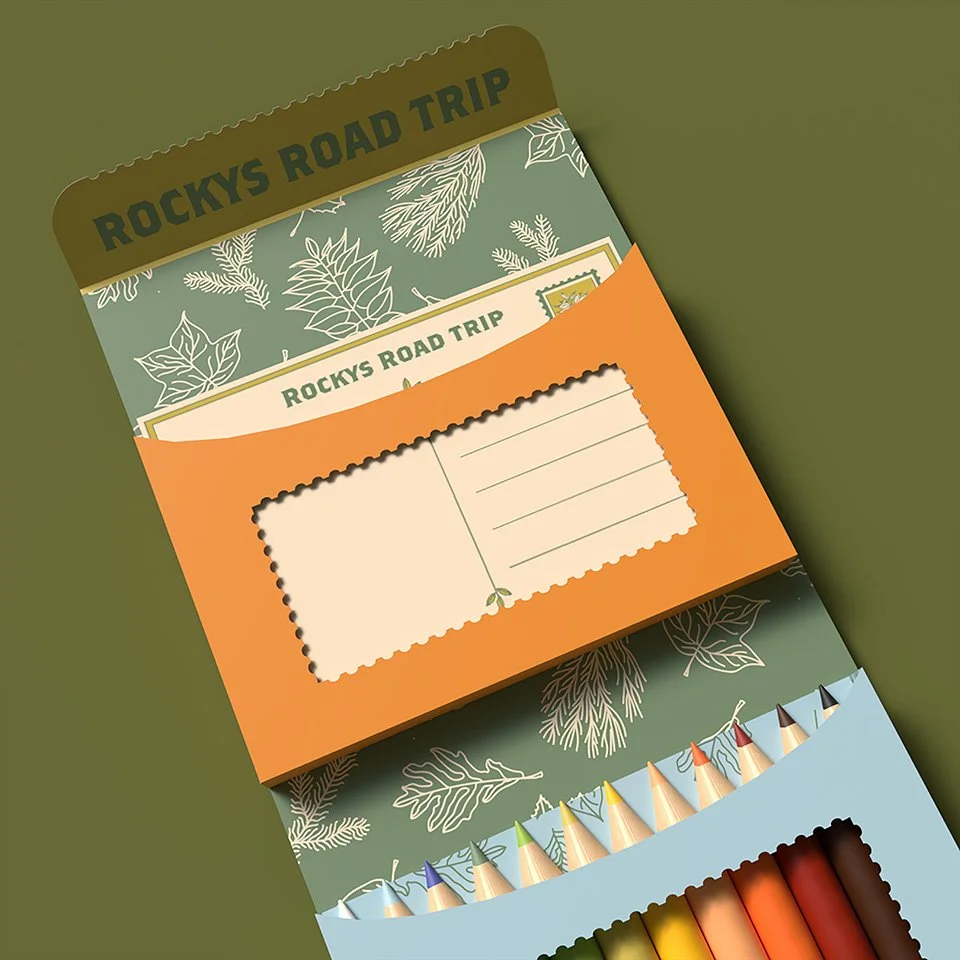 The second compartment holds colored pencils for writing and coloring in the back of the postcards.